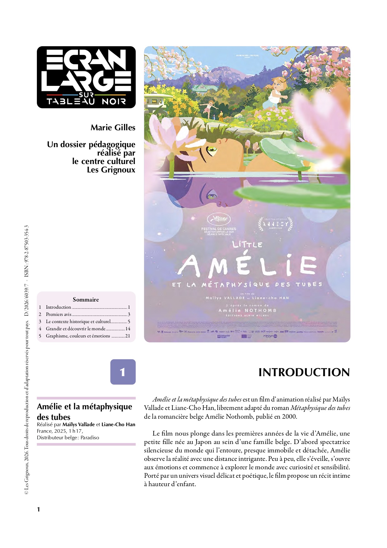 Destiné aux élèves à partir de huit ans, ce dossier pédagogique propose une exploration progressive de l’œuvre. Il invite d’abord à situer le récit dans son contexte historique et culturel, en mettant notamment en lumière certains aspects de la culture japonaise. Il accompagne ensuite les élèves dans une réflexion autour des liens affectifs, du passage de la petite enfance vers une conscience plus affirmée de soi et de l’autre. Enfin, une attention particulière est portée à l’esthétique graphique, à travers une analyse du graphisme, des couleurs et de leur rôle dans l’expression des émotions.